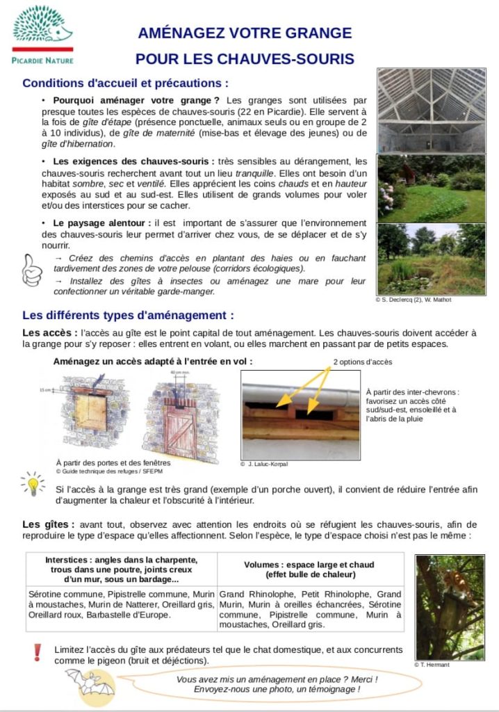 Vous pouvez consulter et télécharger les différentes fiches thématiques ci-dessous “Aménager votre grange et grenier pour les chauves-souris”, “Construire un gîte en bois” et “Reconnaitre une crotte de chauves-souris”.