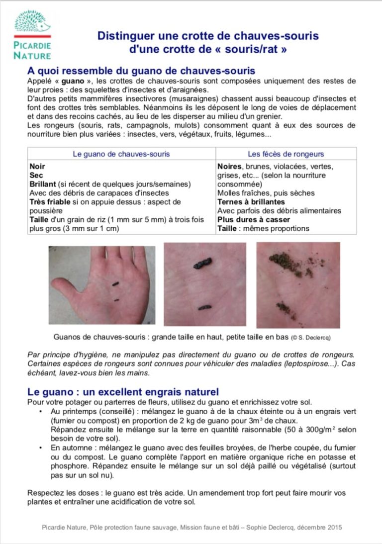 Vous avez trouvé des petites crottes mais ne savez pas à qui elles appartiennent ; chauves-souris ? souris ? rat ? Cette petite fiche vous expliquera comment reconnaitre une crotte de chauves-souris aussi appelée GUANO. Qui par ailleurs est un très bon engrais naturelle.