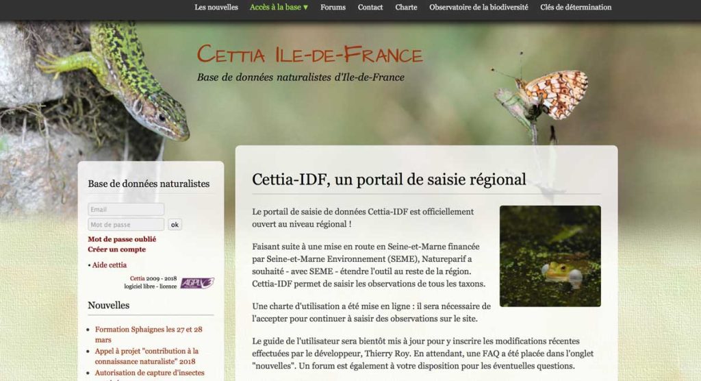 L’Agence Régionale pour la Biodiversité (ARB-anciennement NatureParif) a mis en place une base de données régionale en Ile-de-France CETTIA. Cette base permet à tous les utilisateurs de pouvoir saisir leurs données naturalistes et de les visualiser.