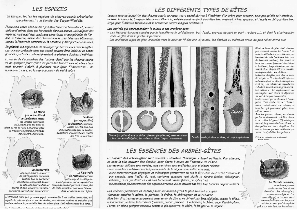 La plaquette de sensibilisation “Les chauves-souris et les arbres” présente les différents types de gîtes et les chauves-souris susceptibles de les occuper.
